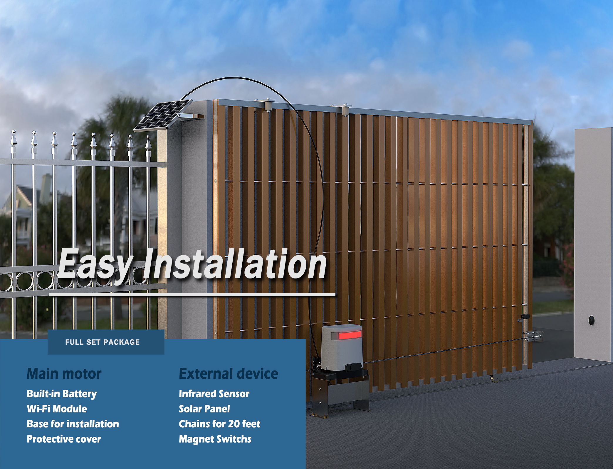 • ⚙️ Funzionamento potente, sicuro e fluido: l'apriporta per cancello scorrevole Blütezeit utilizza un Motore da 280 W muoversi cancelli fino a 1400 libbre. Il sensore a infrarossi si ferma e inverte la marcia quando rileva ostacoli. Include 2 catene da 9,84 piedi per un funzionamento silenzioso e regolare in diverse condizioni atmosferiche.