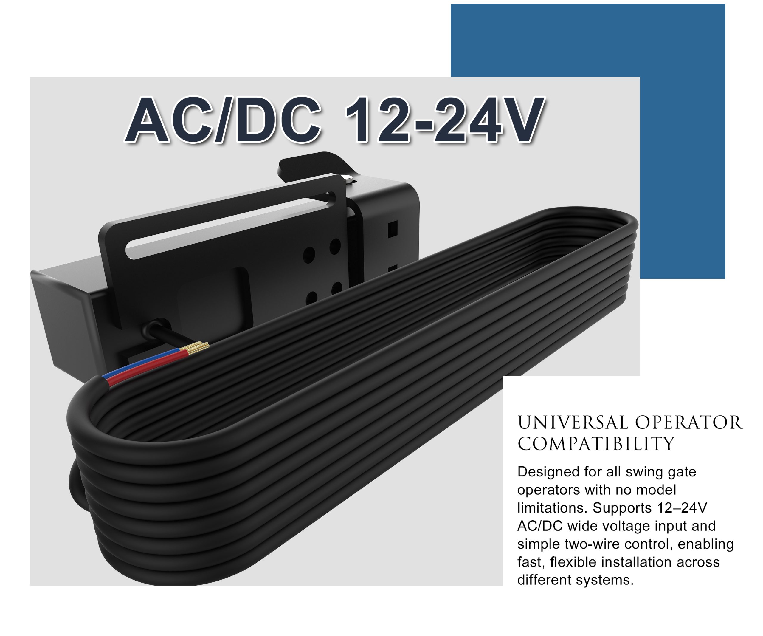 - 🔒 Universal Compatibility – Works with all single and dual swing gate operators. Supports 12–24 V AC/DC input and simple two-wire control for easy integration with most gate systems.