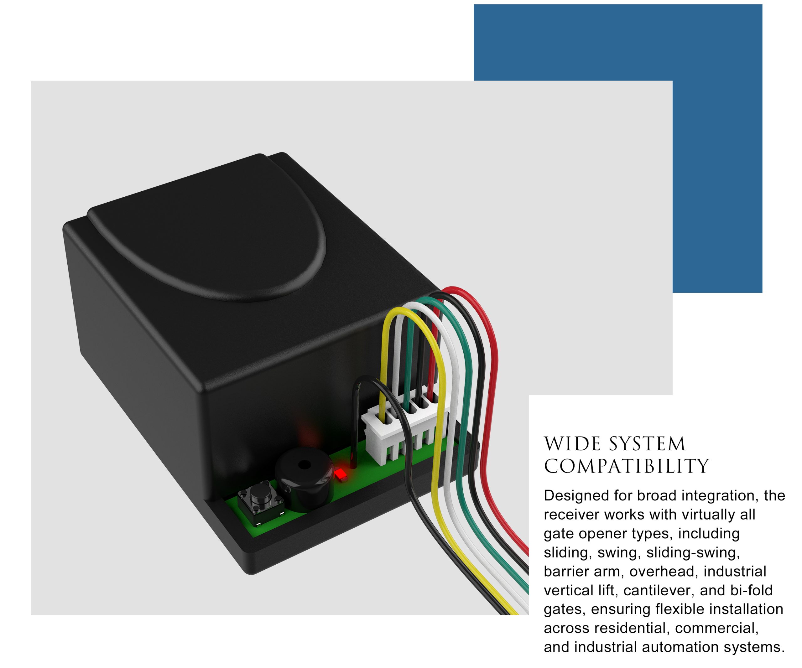 Universal Compatibility – Designed for broad integration with most gate openers; ideal for residential, commercial, and industrial sliding and swing gates. Solar-powered systems are recommended to use AC power for stable operation when paired with the wireless edge.